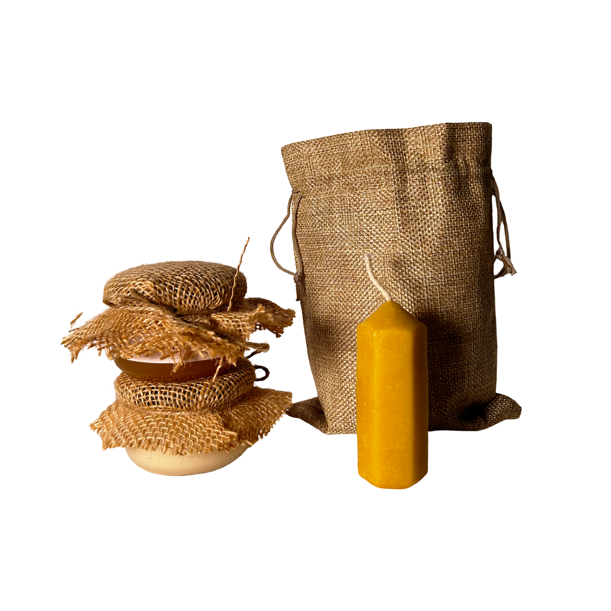 Sudėtis: 150g visų žiedų medaus, 150g kreminio medaus, 1vnt. rankų darbo bičių vaško žvakė