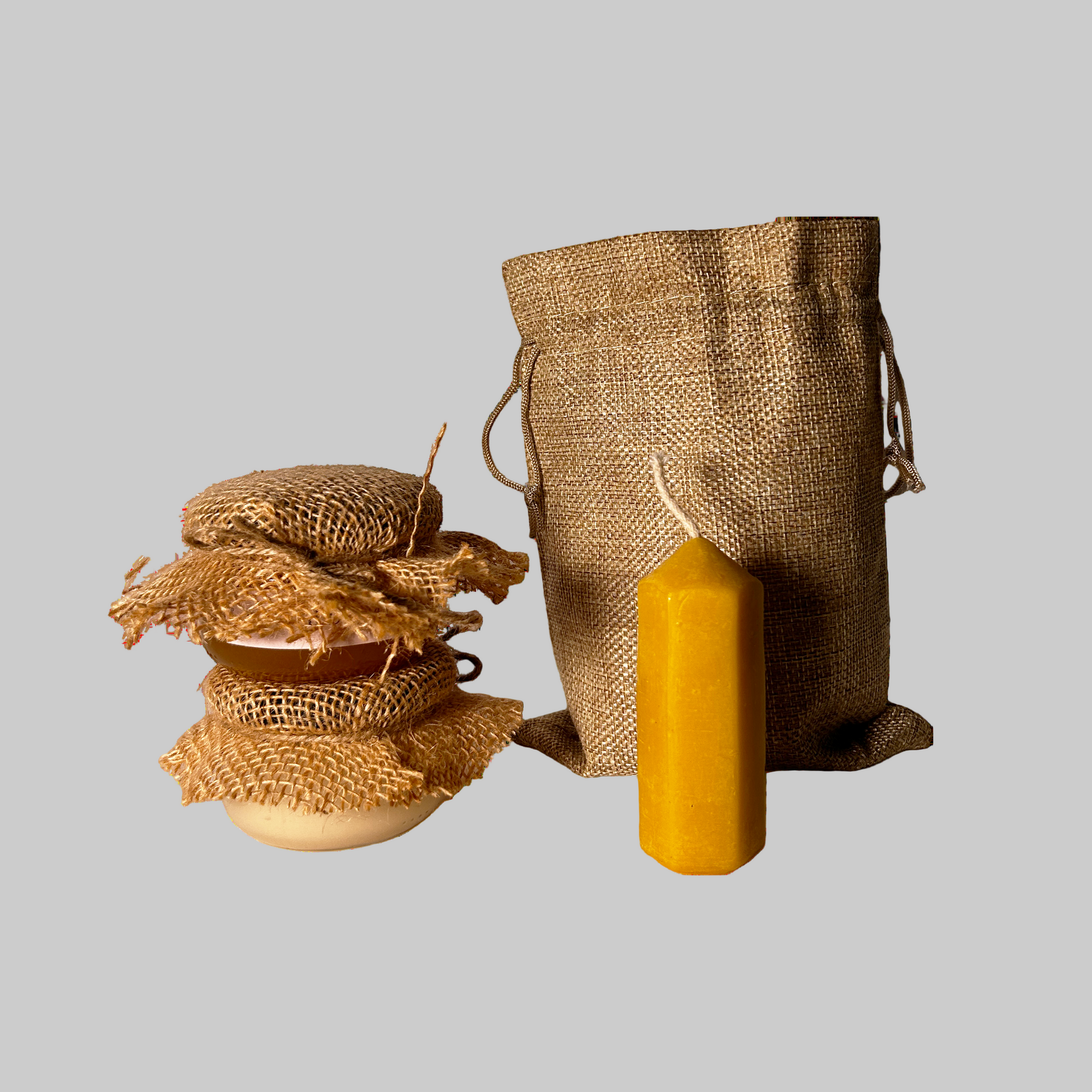 Kreminis medus papildo rinkinį savo švelniu, lengvu saldumu ir puria tekstūra, kuri puikiai dera su desertais, košėmis ar puodeliu arbatos. Bičių vaško žvakė užbaigia šį derinį subtiliu natūralumo prisilietimu - jos liepsna skleidžia jaukų medaus kvapą ir paverčia paprastą akimirką šiltesne. Tai rinkinys, atnešantis į namus mažą kasdienės ramybės ritualą.