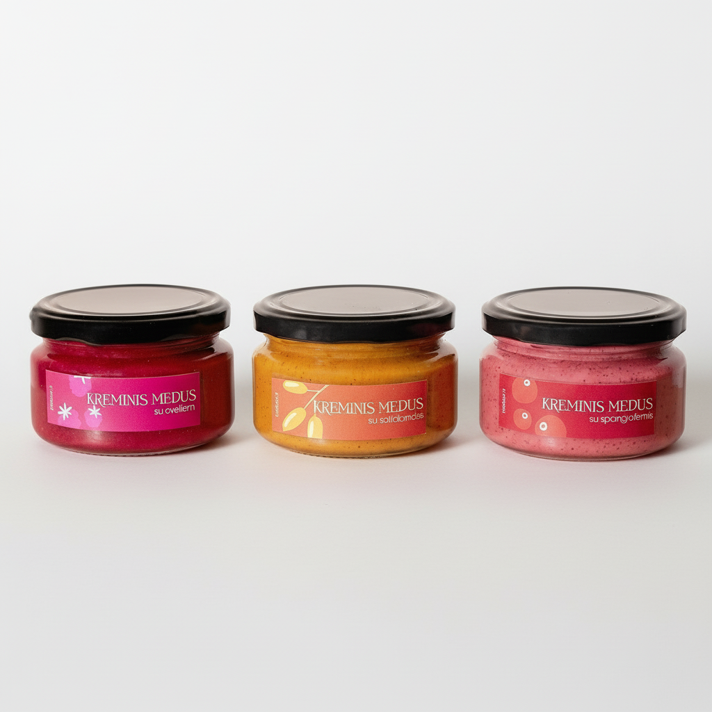 Sudėtis: 300 g medaus su avietėmis, 300 g medaus su šaltalankiais, 300 g medaus su spanguolėmis